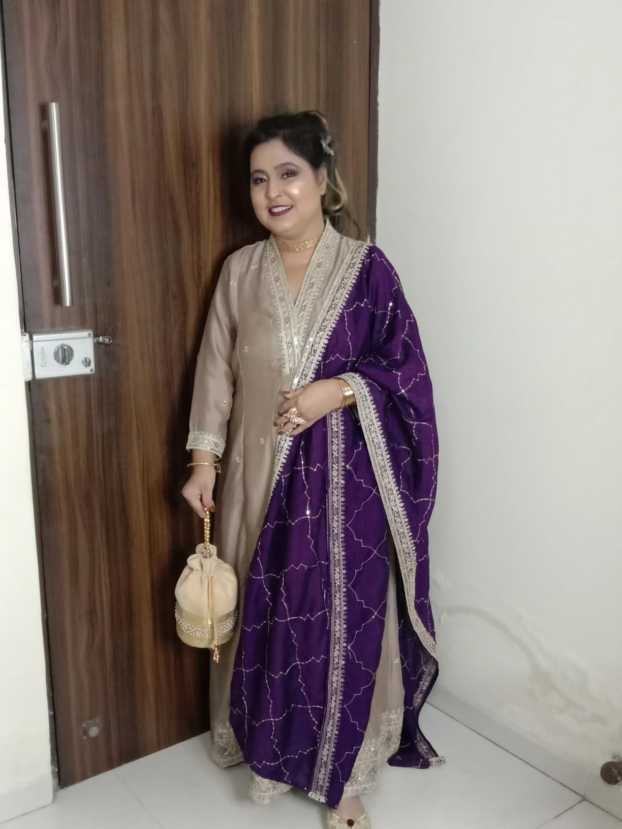 Includes : Readymade Stitched Grey Color Anarkali Kurti (or) Kurta with Tailored Fit Pant and Matching Violet Color Dupatta